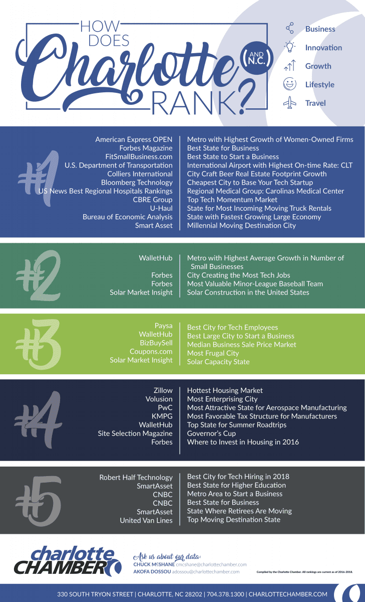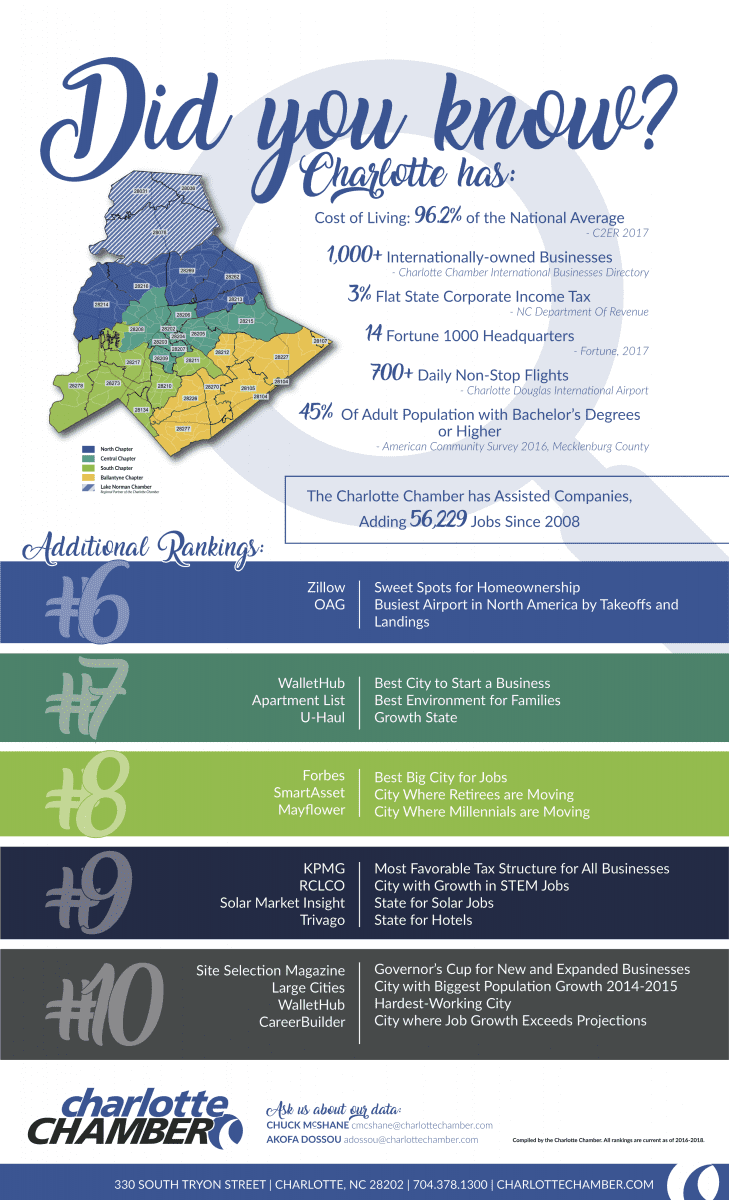 Here are just a few of Charlotte’s claims to fame, as presented by the Charlotte Chamber of Commerce: